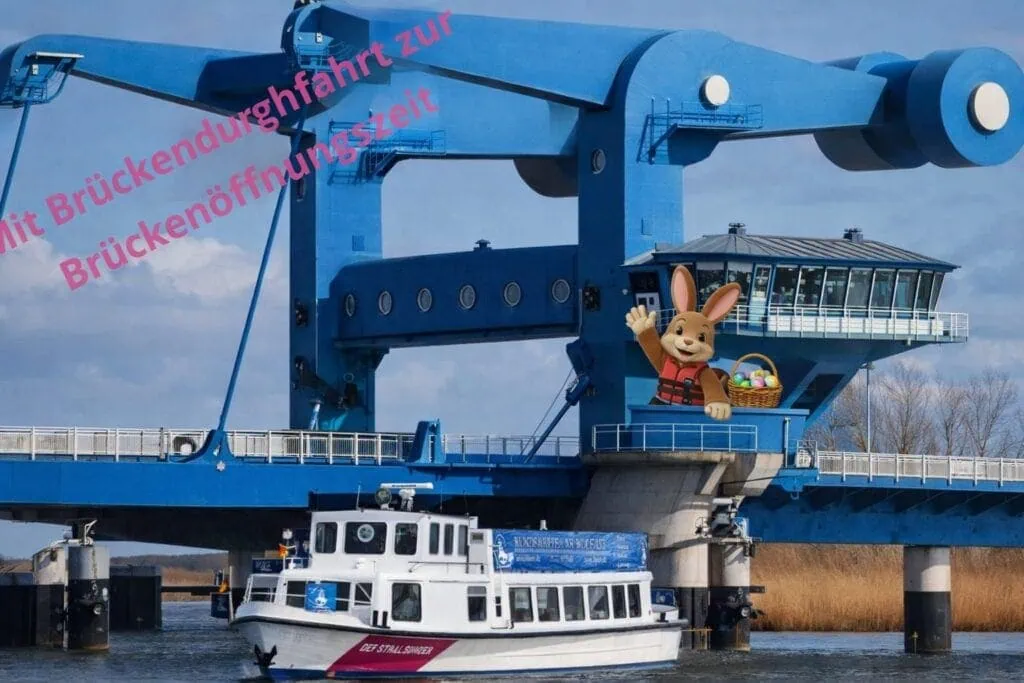 Vom Stadthafen Wolgast aus fahren wir den Peenestrom in Richtung des Museumshafens Peenemünde mit seinen zahlreichen Museen und Schiffen. Auf der Fahrt halten Sie Ausschau nach Fischottern, Bibern und zahlreichen Vögeln, wie Seeadlern und Seeschwalben. Nach der Wendung in Peenemünde geht die Fahrt zurück nach Wolgast und ein zweites Mal durch die Peenebrücke, dem blauen Wunder, hindurch. Auf hin oder Rückfahrt durchfahren wir die Brücke zur Öffnungszeit!